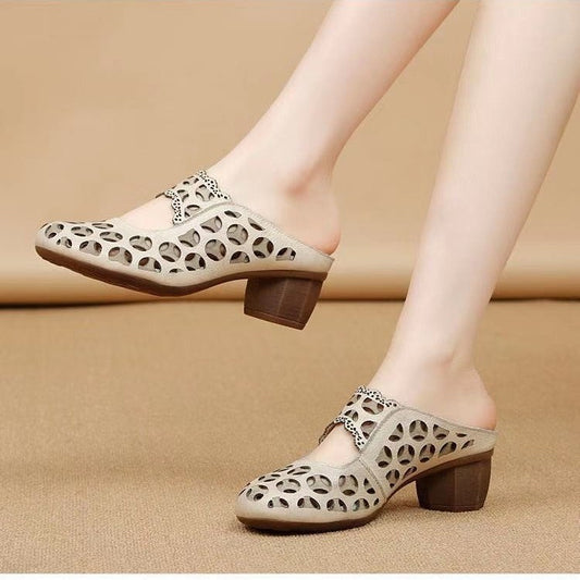 Women's Retro Fashion Hollow Hole Shoes PU Leather Clogs Shoes Round Head Slip On Femme Slippers